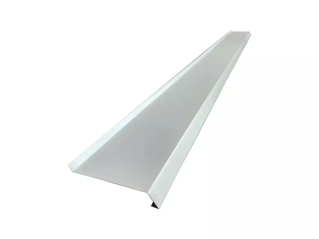 Valmiiksi taivutettu valkoinen (RR20) vesipelti, suorat päädyt. Pituus 2000mm, takareuna 15mm, etureuna 30mm, syvyys (a-mitta) 150mm, materiaali 0,5mm peltiä, taka- ja etureunan pokkaus n. 110 astetta