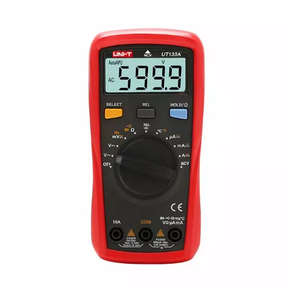UT133A yleismittari on kosketukseton, ammattikäyttöön sopiva mittari. Sillä voidaan mitata vaihto- ja tasajännitettä, -virtaa, vastusta ja diodeja.Suuri mittausalue: Uni-T yleismittari mittaa tasajännitteen ja vaihtojännitteen jopa 600 V asti, tasavirran jopa 10 A astiMittarissa on taustavalo.