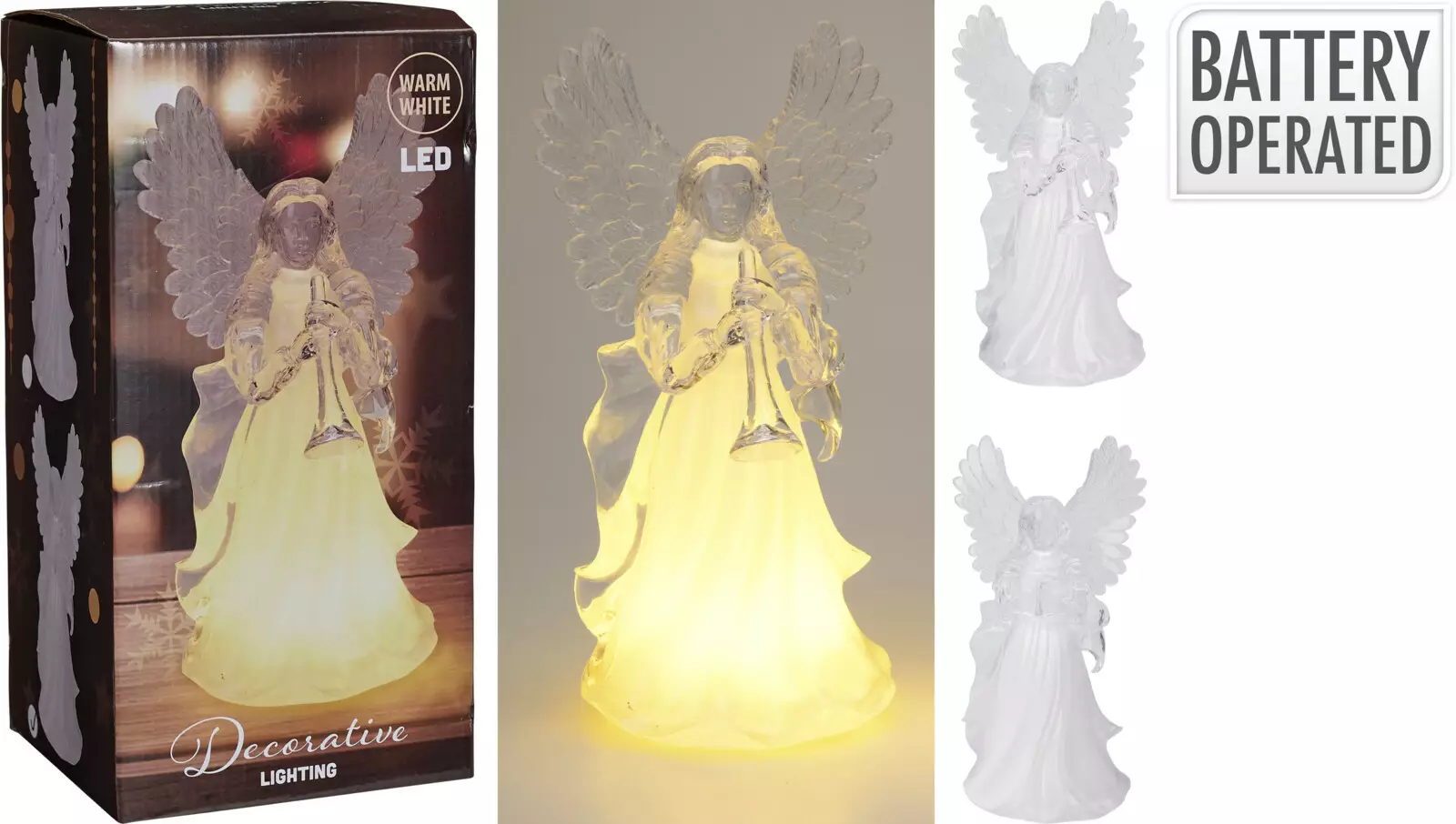 Upeasti viimeistelty akryylinen enkelikoriste, joka loistaa lämpimän valkoisella LED-valolla. Saatavilla kaksi erilaista mallia – enkeli trumpetin tai kirjan kanssa. Kaunis koriste joulun... Lue lisää