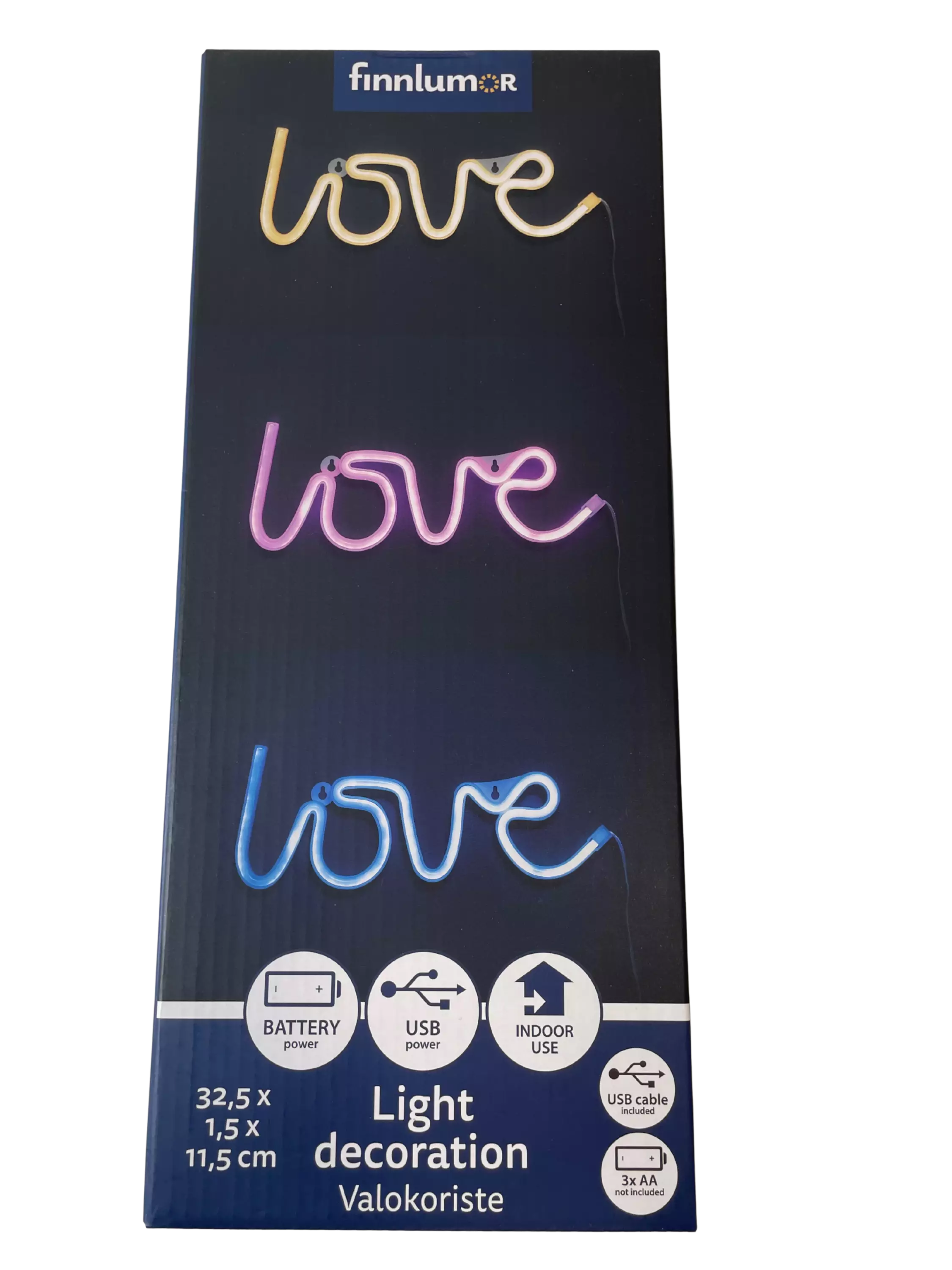 Urbaania tunnelmaa. Love-teksti neon LED-valo tuo huoneeseen persoonallisuutta ja leikkisyyttä. Helppo asentaa ja käyttää. Valo toimii paristoilla sekä USB-virralla. USB-virtaa käytettäessä paristot on otettava pois paristokotelosta. Paristot 3 x AA (ei sisälly). IP20 sisäkäyttöön.