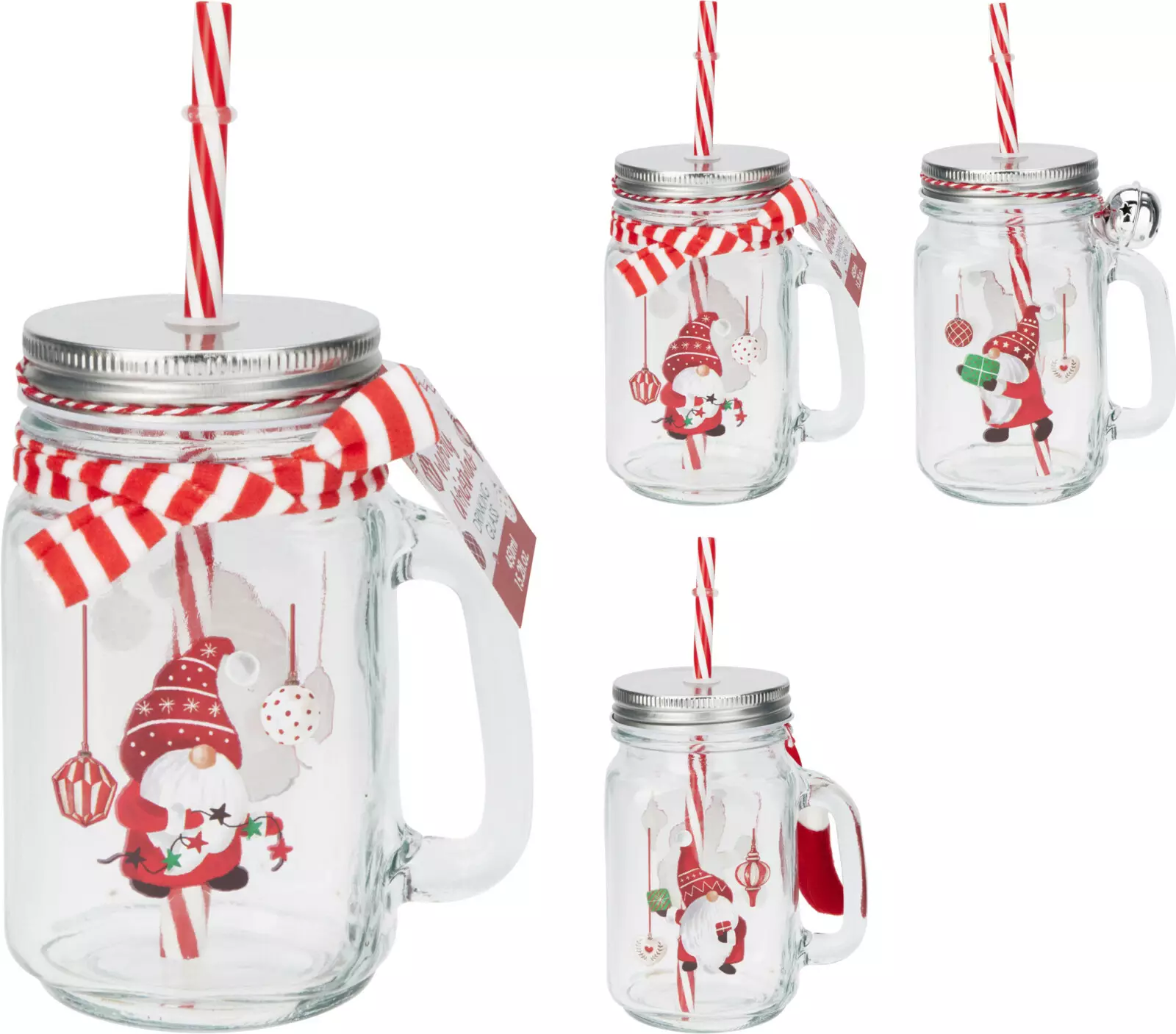 Hauska lasinen juomamuki, jossa on jouluinen kuvitus ja metallikansi pillillä. Sopii erinomaisesti glögille, mehuille ja muille kylmille juomille. Muki on koristeltu iloisilla jouluteemaisilla hahmoilla ja punavalkoisella nauhalla, mikä tekee siitä myös mainion lahjaidean. Vetoisuus 450 ml.