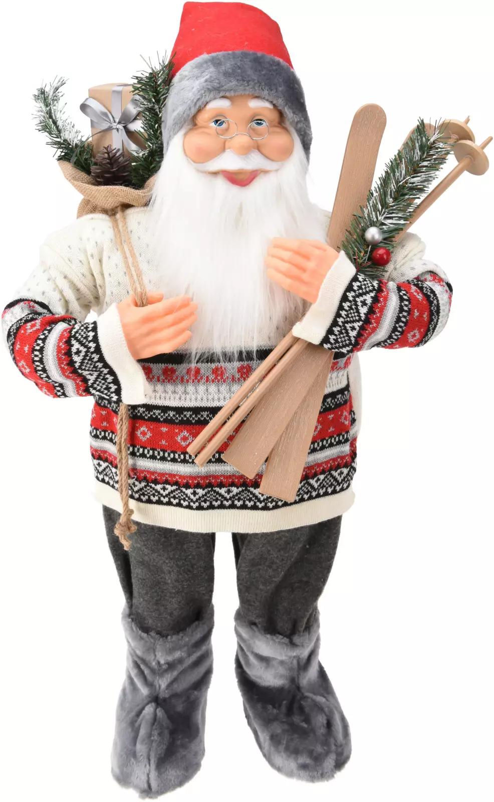 Näyttävä seisova joulupukki, jolla on yllään lämmin talvineule, harmaat housut ja muhkeat turkissaappaat. Pukki kantaa olallaan lahjasäkkiä sekä puisia suksia – valmiina joulun matkalle!... Lue lisää