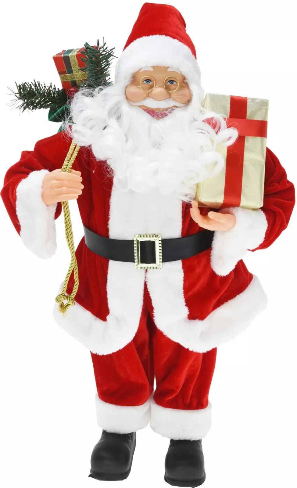 Perinteinen seisova joulupukki, jolla on kädessään lahjapaketti ja olalla vihreä säkki. Joulupukin asu on punainen valkoisin karvareunuksin ja hänellä on kultaiset silmälasit sekä hymyilevät kasvot. Upea koriste esimerkiksi kuusen viereen tai eteisen koristukseksi.Materiaali: 50 % muovia, 45 % kangasta, 5 % rautaaVäri: punainenKoko: 30 × 20 × 60 cmPaino: 800 g