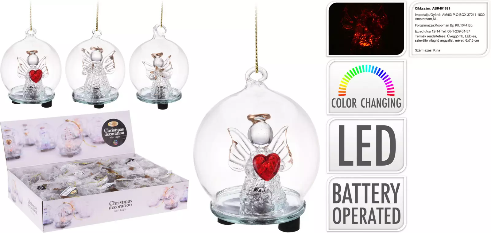 Kuusenkoriste enkeli lasipallossa 8 cm, LED-valoillaKaunis lasipallo, jonka sisällä on yksityiskohtainen enkeli. Koristeessa on väriä vaihtava LED-valo, joka luo tunnelmallisen ja rauhallisen valaistuksen. Paristokäyttöinen (3 x AG3-paristo sisältyy).Lajitelma sisältää kolme erilaista enkelimallia.Voit ilmoittaa mallitoiveesi ostoskorin lisätietokentässä. Mikäli toivomaasi mallia ei ole varastossa, toimitamme sattumanvaraisen mallin varastotilanteen mukaan.