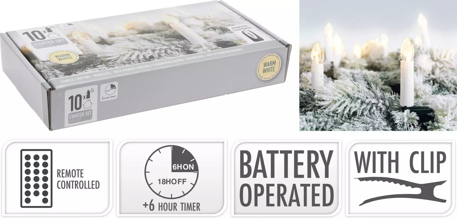 Kaunis ja käytännöllinen langaton LED-kynttiläsarja, joka tuo kodikasta tunnelmaa ilman johtoja tai liekkiä. Jokaisessa kynttilässä lämminsävyinen LED-valo ja vihreä kiinnitysklipsi. Kaukosäätimestä voit helposti kytkeä kynttilät päälle, pois tai asettaa 6 tunnin ajastimen – valot sammuvat automaattisesti ja käynnistyvät uudelleen seuraavana päivänä samaan aikaan.10 kynttilää (langattomat)Väri: norsunluu / vihreä klipsiKoko: 15 × 105 mm1 lämmin valkoinen LED per kynttiläToimii paristoilla (1× AAA / kynttilä, ei sisälly)Kaukosäädin: ON / OFF / ajastin (6 h päällä, automaattinen toisto)Kaukosäädin toimii 2× AAA-paristolla (ei sisälly)