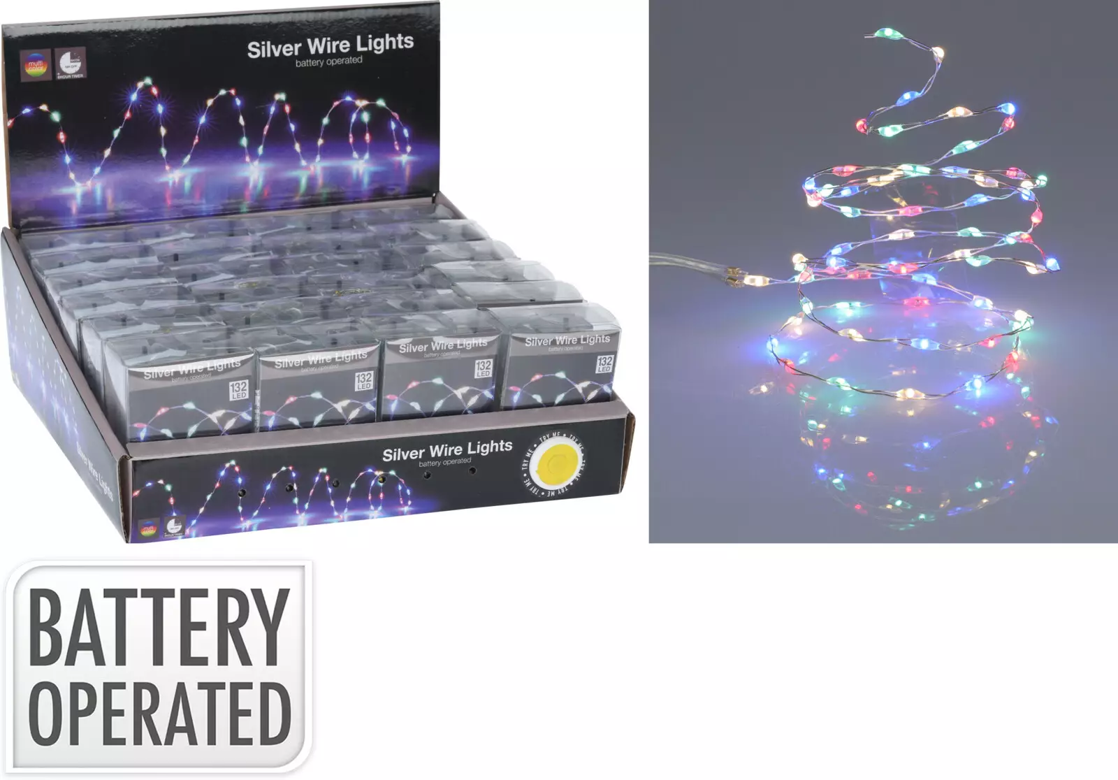 Monivärinen hopealankavalosarja 132 LED, 2 m, paristokäyttöinenSäihkyvä hopealankavalosarja, joka loistaa monivärisin LED-valoin ja tuo iloa ja väriä sisustukseen tai juhlakoristeluun. Taipuisa hopealanka on helppo muotoilla esimerkiksi maljakkoon, kranssiin tai kattaukseen.132 moniväristä LED-valoaPituus: 2 mLamppuväli: 1,5 cmJohto: 30 cmParistokäyttöinen (3 × AA, ei sisälly pakkaukseen)Ajastintoiminto: 6 h päällä / 18 h pois päältäSisäkäyttöön