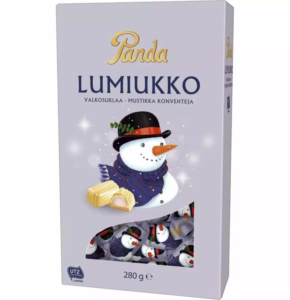 Panda Lumiukko valkosuklaakonvehdit pitävät sisällään herkullisen mustikka-maitotryffelitäytteen.