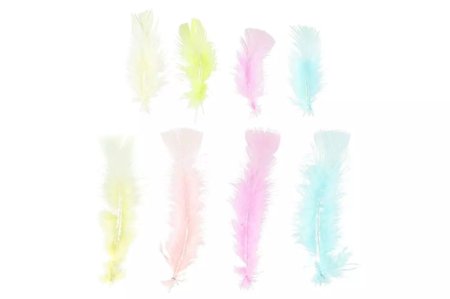 Kauniita höyheniä pastelliväreissä. Höyhenissä on rautalanka, joka helpottaa höyhenien kiinnittämistä. Höyhenen pituus n. 15 cm.