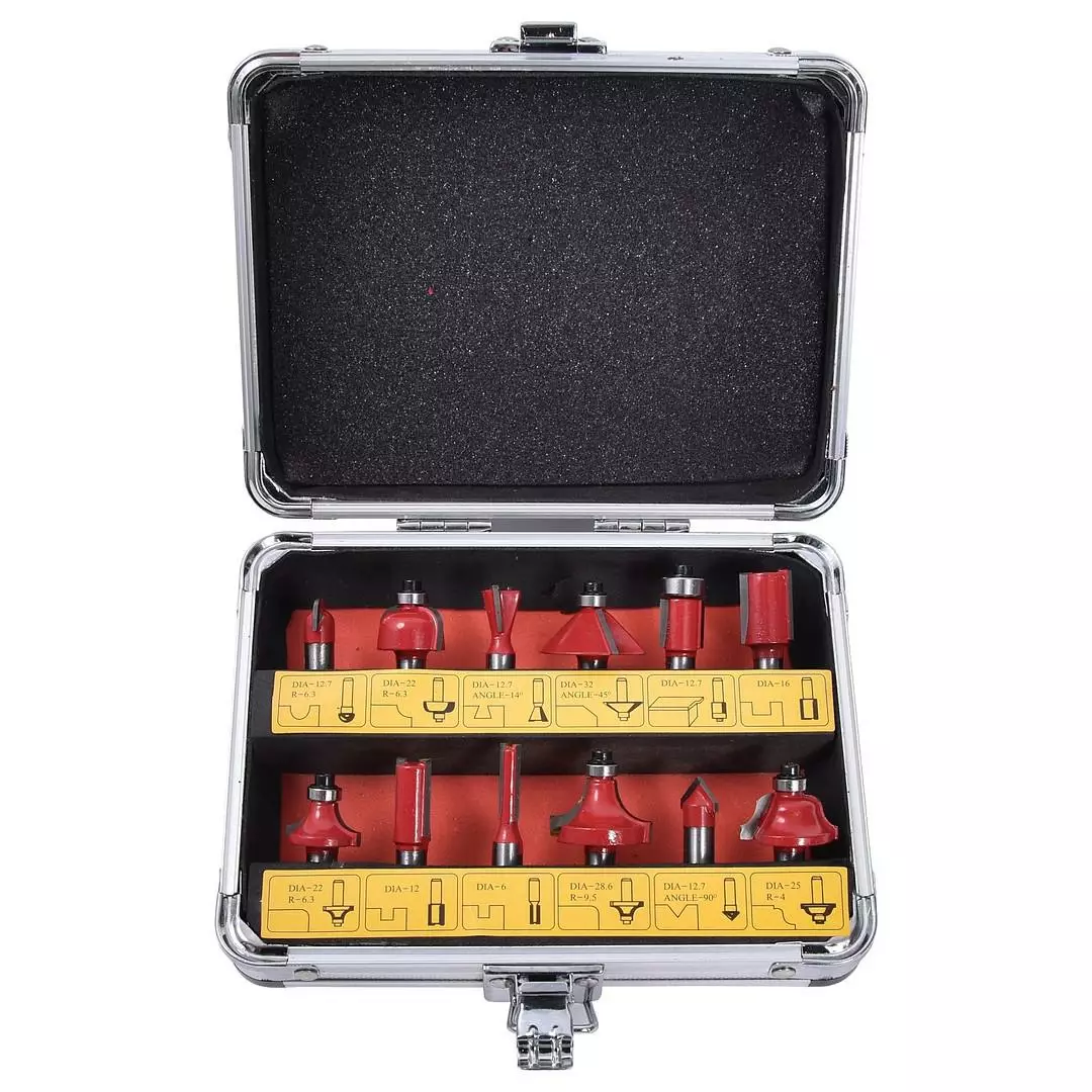 Pakkaukseen sisältyy metallinen säilytyslaatikko ja 12 erilaista jyrsin terää.