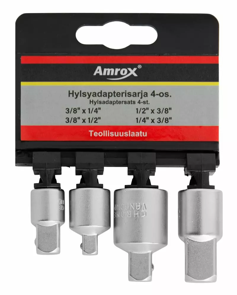 -materiaali kromi-vanadium-terästä, satiini viimeistely-sarjassa 4 kpl hylsyadaptereita, koot:--1 kpl 3/8" x 1/4"--1 kpl 3/8" x 1/2"--1 kpl 1/2" x 3/8"--1 kpl 1/4" x 3/8"-koko: naaras – uros-nelikulmainen vääntiö hylsylle-vääntiön jousikuormitteinen kuula toimii hylsyn pikalukituksena-IP-ripustinpakkaus-ikuinen materiaalitakuu