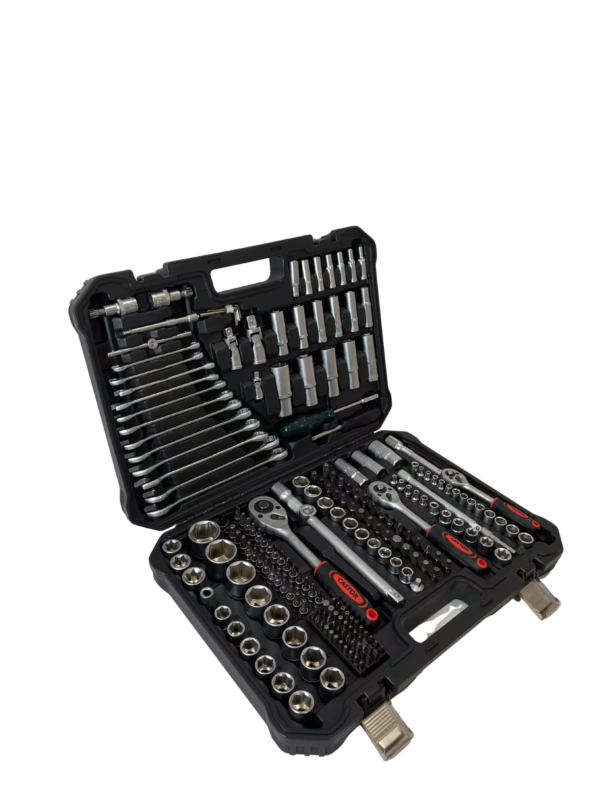 Iso 216-osainen hylsyavainsarja kotikäyttöön tai ammattilaisilleLaadukas ja erittäin kattava 216-osainen hylsyavainsarja on erinomainen valinta niin kotimekaanikolle kuin ammattikäyttöön. Hylsysetti on pakattu tukevasti muovisalkkuun, joka pitää kaikki osat siistissä järjestyksessä ja helposti mukana kuljetettavissa. Mukana on yleisimmät hylsyt, kolme räikkäväännintä, laaja valikoima kärkiä sekä kiintoavaimia ja lisävarusteita.Kattava työkalusarja sisältää erikokoiset räikät ja lenkitIso hylsysarja sisältää muun muassa kolme erikokoista räikkäväännintä (1/4", 3/8" ja 1/2"), 12 kiintoavainta (8–22 mm), useita jatkovarsia ja niveliä sekä erilaisia sytytystulppahylsyjä. Yleisimmät hylsykoot ja kärjet takaavat, että työkalut soveltuvat autojen, pienkoneiden ja muiden laitteiden huoltoihin ja korjauksiin. Selkeästi järjestetty muovikotelo pitää hylsyt ja osat omilla paikoillaan ja tekee oikeankokoisen työkalun löytämisestä nopeaa.Sisältö (216 osaa):1/4" hylsyt:13 kpl (4–14 mm)7 kpl pitkät hylsyt (4–10 mm)30 kpl 1/4" hylsykärkiä1 kpl liukuvarsi1 kpl jousikahva1 kpl kuusiokahva44 kpl 1/4" kärkiä3/8" hylsyt:10 kpl (10–19 mm)6 kpl pitkät hylsyt (10–15 mm)1/2" hylsyt:16 kpl (10–32 mm)5 kpl pitkät hylsyt (16–22 mm)Lisäksi:17 kpl E-hylsyjä3 kpl sytytystulppahylsyjä3 kpl räikkää (1/4", 3/8" ja 1/2")5 kpl jatkovarsia12 kpl kiintoavaimia (8–22 mm)30 kpl 5/16" kärkiä7 kpl kuusiokoloavaimia3 kpl niveliä1 kpl tukeva muovikotelo