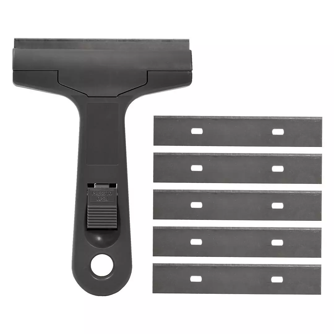 Ergonominen kahva varmistaa mukavan työskentelyn. Helposti vaihdettava terä. Mukana 5-vaihtoterää. -Soveltuu maalin/lakan poistoon esim. ikkunoista -Terän leveys 102mm