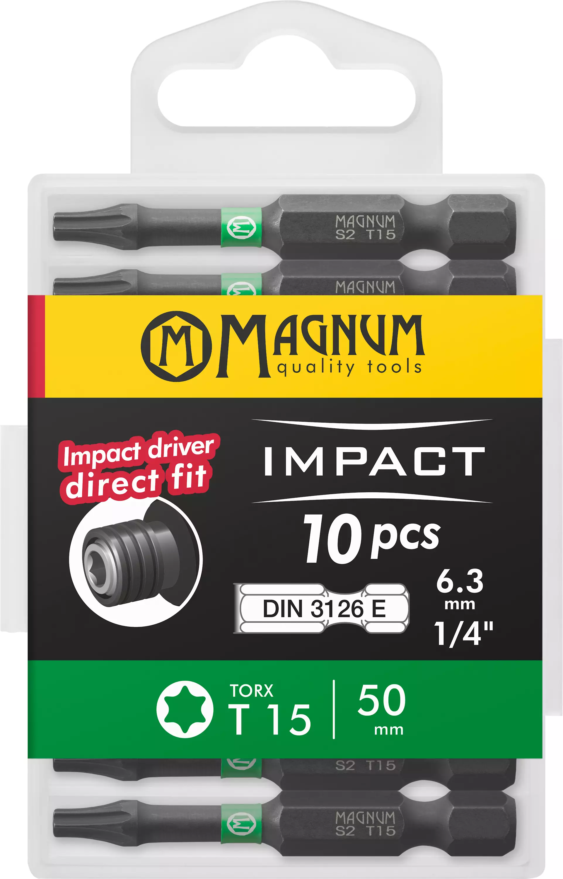 Erityisesti iskevään vääntimeen tarkoitettuja konekiinnitteisiä TORX-ruuvauskärkiä. Kärjen ominaisuudet ja muotoilu tuottavat parhaan iskevän voiman sekä pisimmän käyttöiän suoraan vääntimeen kiinnitettynä. Valmistettu tarkasti lämpökäsitellystä S2-työkaluteräksestä iskevää käyttöä kestävällä muotoilulla. Pakattu uudellensuljettavaan ja ripustettavaan 10 kappaleen muovirasiaan. Ruuvityyppi on nähtävissä helposti jokaisen kärjen varressa olevan renkaan väristä.