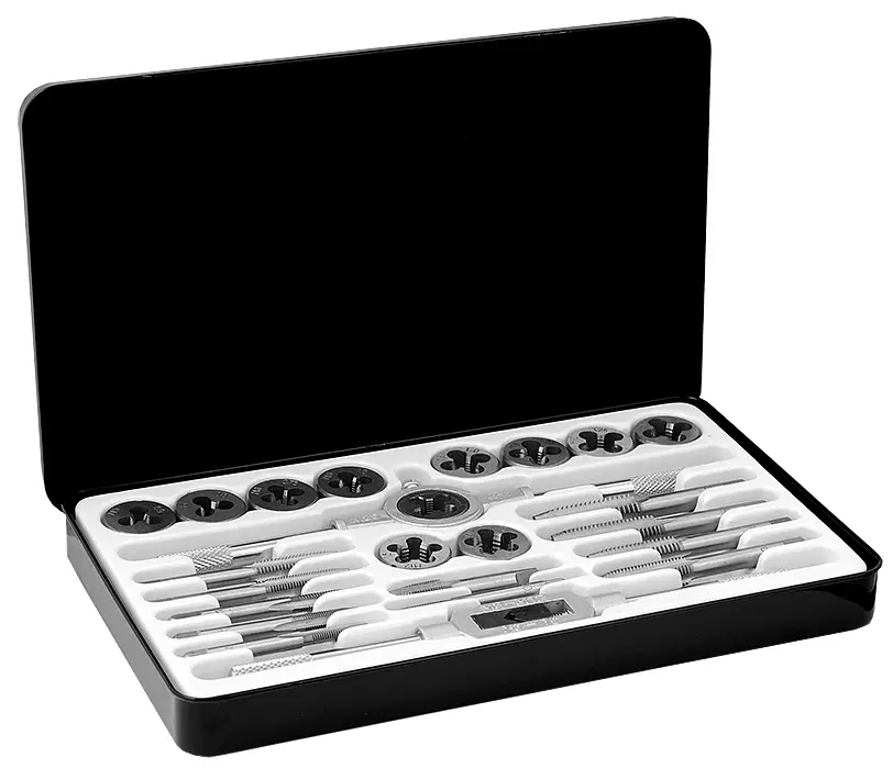 ProMaster -24-osainen sarja sisältää--10 mm tapit ja pakat M5x0.8, M5x0.9, M6x0.75, M6x1.0, M8x1.0, M8x1.25, M10x1.25, M10x1.5, M12x1.5, M12x1.75, 1/8NPT27--1 kpl kierrepakan väännin, halkaisija 25 mm--1 kpl kierretapin väännin M3-M12-metallinen säilytyslaatikko-värillinen pahvipakkaus-takuu 1 vuosi