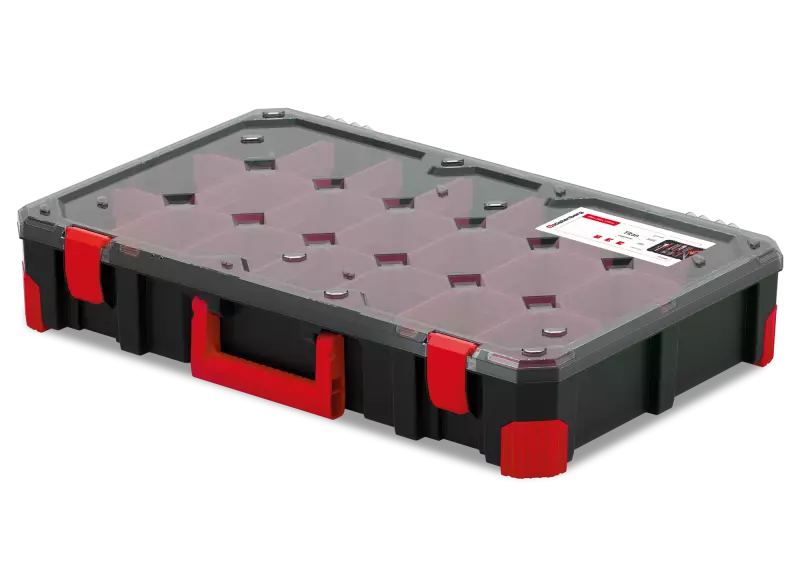 Kestävä polymeeriseosrunko. Elastomeerikulmat. Ergonominen kahva. Mekaanisesti kestävä polykarbonaattikansi. ABS-kiinnikkeet. Erottimet. Koko: 598x390x110mm.