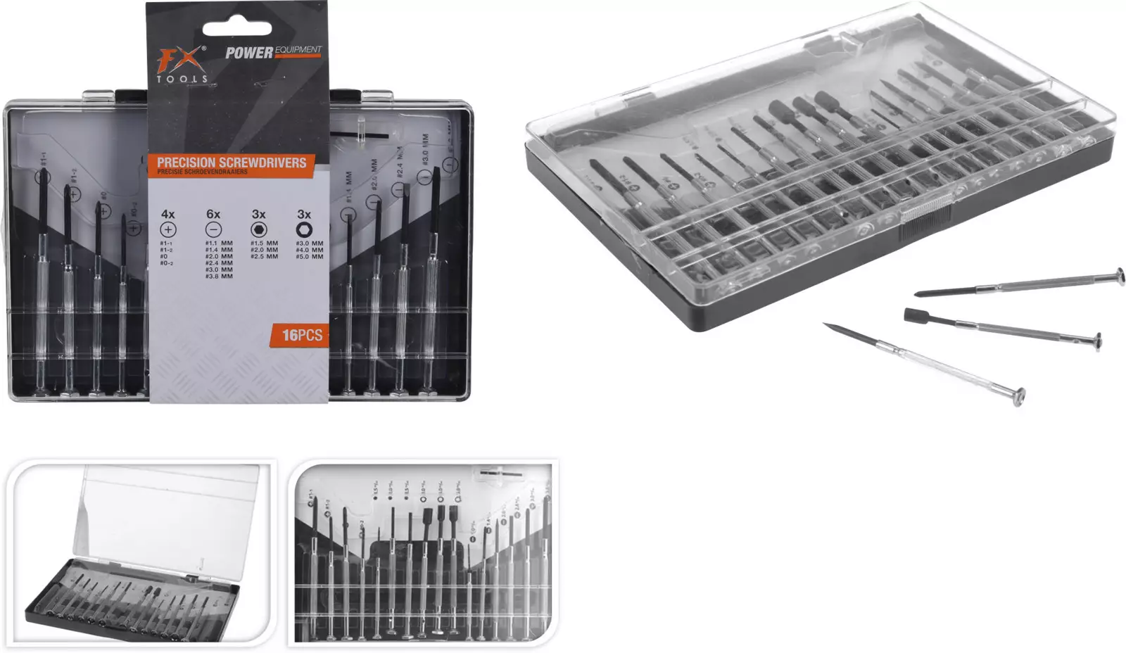 Monipuolinen 16-osainen tarkkuusruuvimeisselisarja, joka on suunniteltu pienten ja herkkien ruuvien käsittelyyn. Sarja sopii erinomaisesti esimerkiksi elektroniikan, silmälasien, kellojen, puhelimien, tietokoneiden, kameroiden ja muiden pienlaitteiden huoltoon ja korjaukseen.