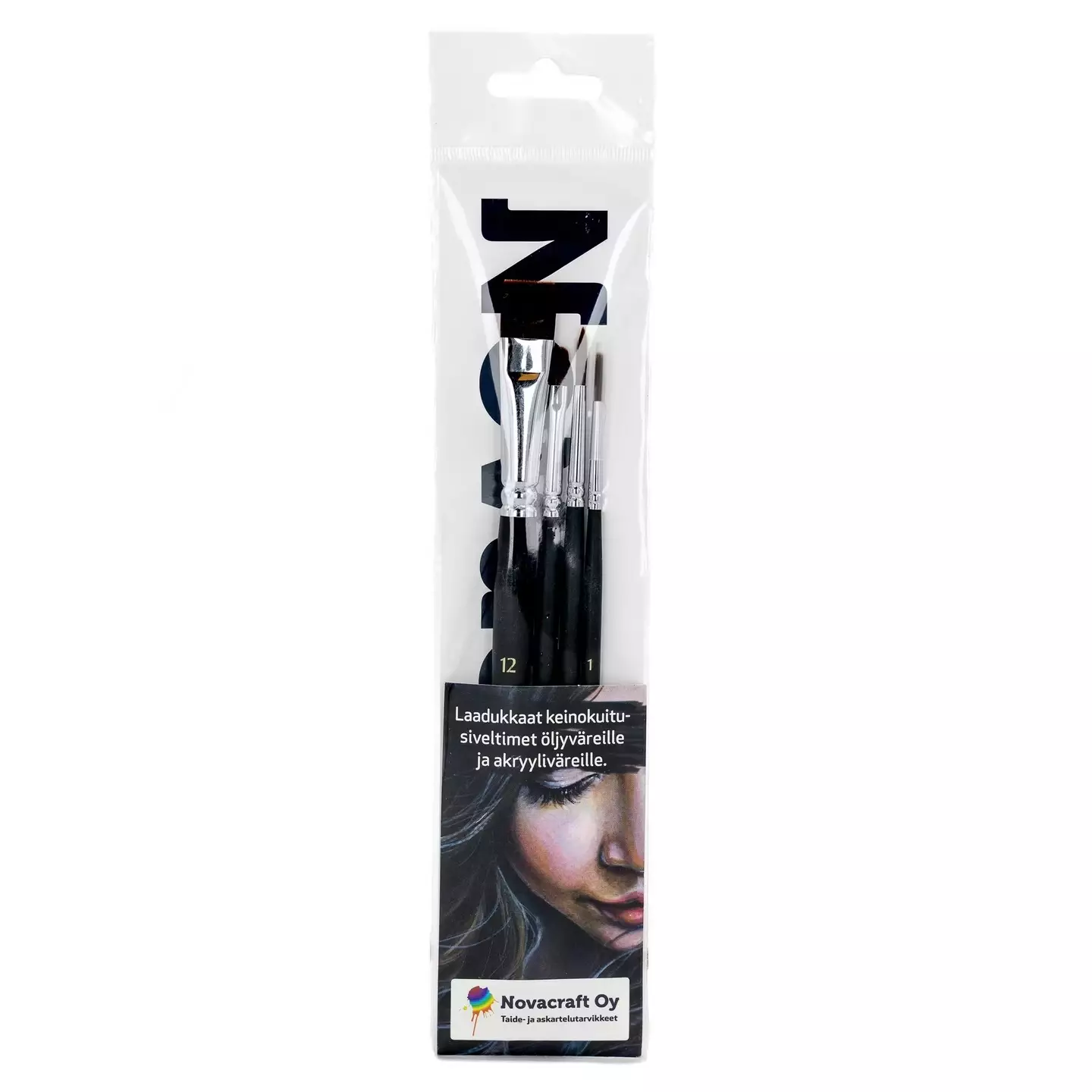 Novacraft keinokuitusiveltimet 4-osaa. Setti sisältää: pyöreä 1 ja 4, tasapäinen 12 ja suippo 6. Siveltimet on helppo puhdistaa ja ne ovat erittäin kestäviä ja sitovat hyvin väriä. Siveltimet sopivat mm. öljy-, akryyli-, vesi- ja guassiväreille.