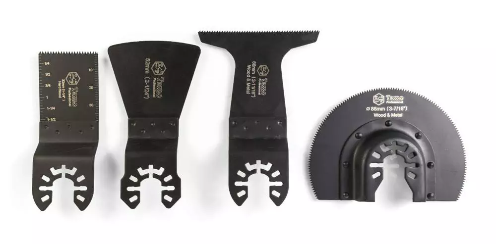 Monitoimikoneen 4-osainen teräsarja. Sis. upotusterät 32 ja 68 mm, puolipyöreä 88 mm, kaavinterä 52 mm. Universal-kiinnityksen ansiosta käy useimpiin markkinoilla oleviin laitteisiin.