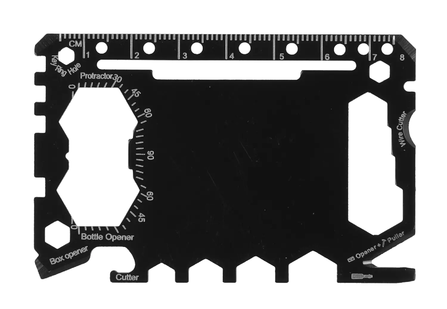 Luottokortin kokoinen monitoimityökalu kulkee helposti mukana ja on saatavilla aina tarpeen tullen. Tuotteessa on 46 erilaista työkalua pienessä paketissa. Ruuvitalttoja, lenkkiavaimia, pulloavaaja, säilykepurkinavaaja, kirjekuorenavaaja, pahvilaatikonavausterä, mitta, johtoleikkuri yms.