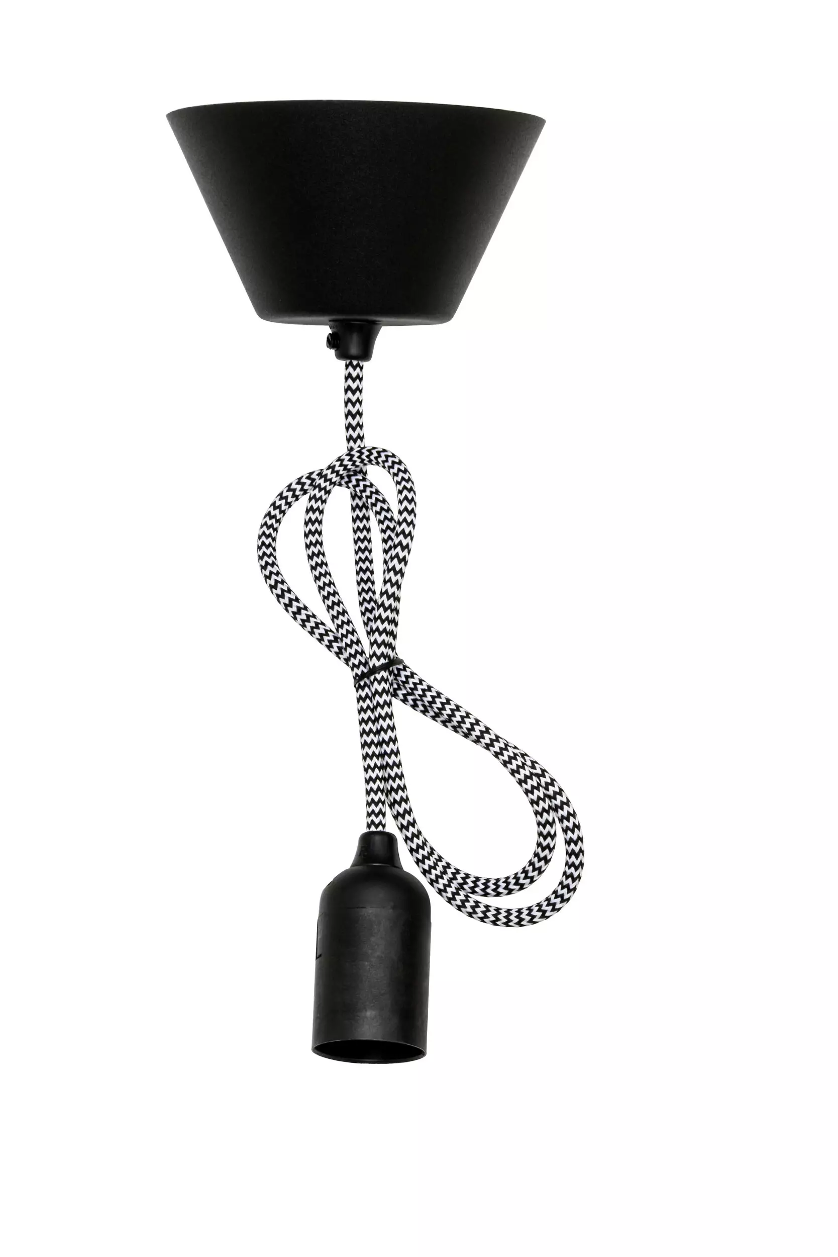 Kangaspintainen valaisinjohto ja muovinen lampunpidin. Kupu ja kanta mustat, johto mustavalkoinen. Pinta-asennus kattoon. Johto H03VV-F 2 x 0.75 mm² 1,2 m. Voi lyhentää haluttuun mittaan. Vain sisäkäyttöön. E27 kanta, maks. LED 10,5 W, lamppu myydään erikseen.