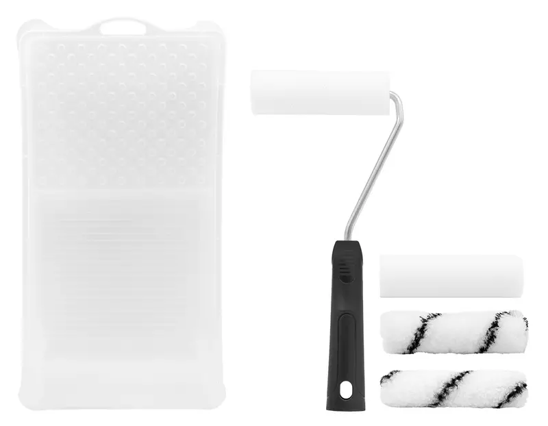 -Yleiskäyttöön sisämaalauksessa -Setti sisältää: --2kpl vaahtomuovitelaa 100mm --2kpl mustaraitatelaa 100mm --varsi 290mm --maalikaukalo