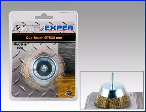 Teräskuppiharja ruosteenpoistoon, puhdistukseen ja maalinpoistoon porakoneeseen, kara Ø 6 mm.