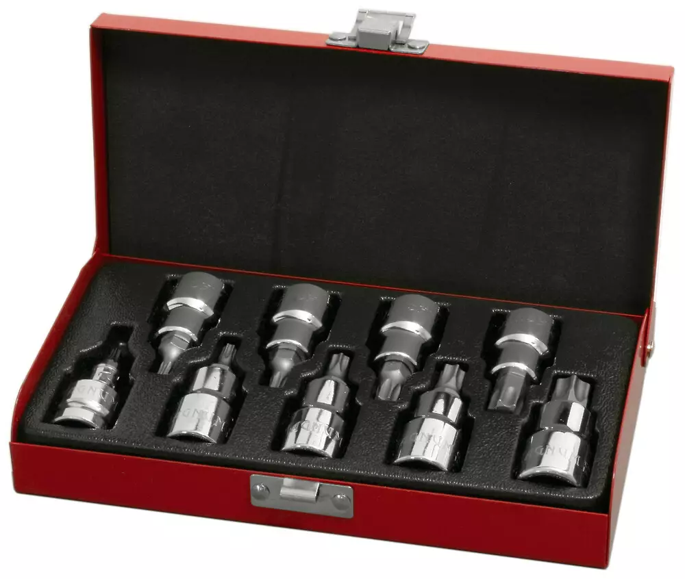 Sarja takomalla peilihiotusta kromivanadiiniteräksestä valmistettuja TORX-kärkihylsyjä. Sarja on koottu tukevaan teräslaatikkoon.