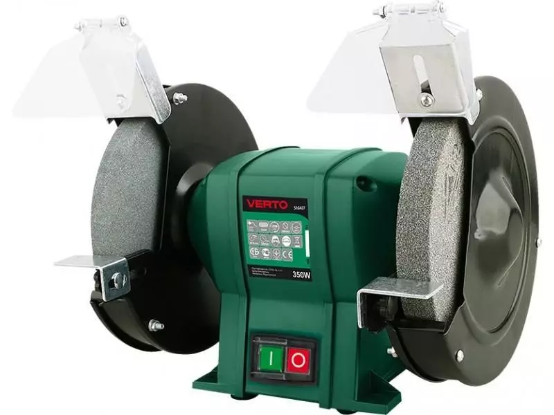 VERTO 350 W pöytähiomakone, jonka laikan halkaisija on 200 mm. Hiomakoneessa on tukeva runko ja sirpalesuojat. Hiomakone toimitetaan kahden hiomalaikan A36 ja A60 kanssa.