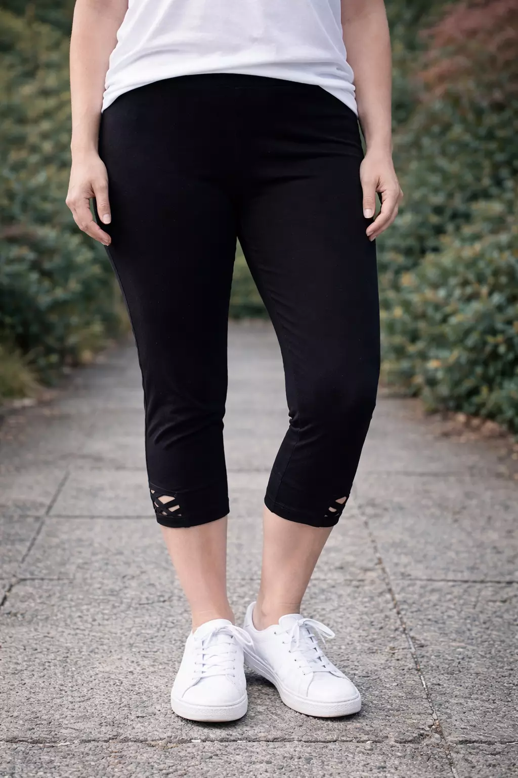Tracy-06-1 Naisten caprileggingsit koot: S-2XL Nilkoissa ommeltuna ristikko. 95% puuvillaa, 5% elastaania. Pesu 30°, silitys *, kuivausrumpu kielletty.