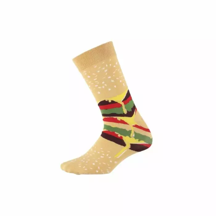 Hampurilaispakkaukseen pakatut sukat. Hauska lahja hänelle, jolla on jo kaikkea. Materiaali 70 % puuvilla 28 % polyesteri 2 % elastaani. Pesu 30 asteessa.
