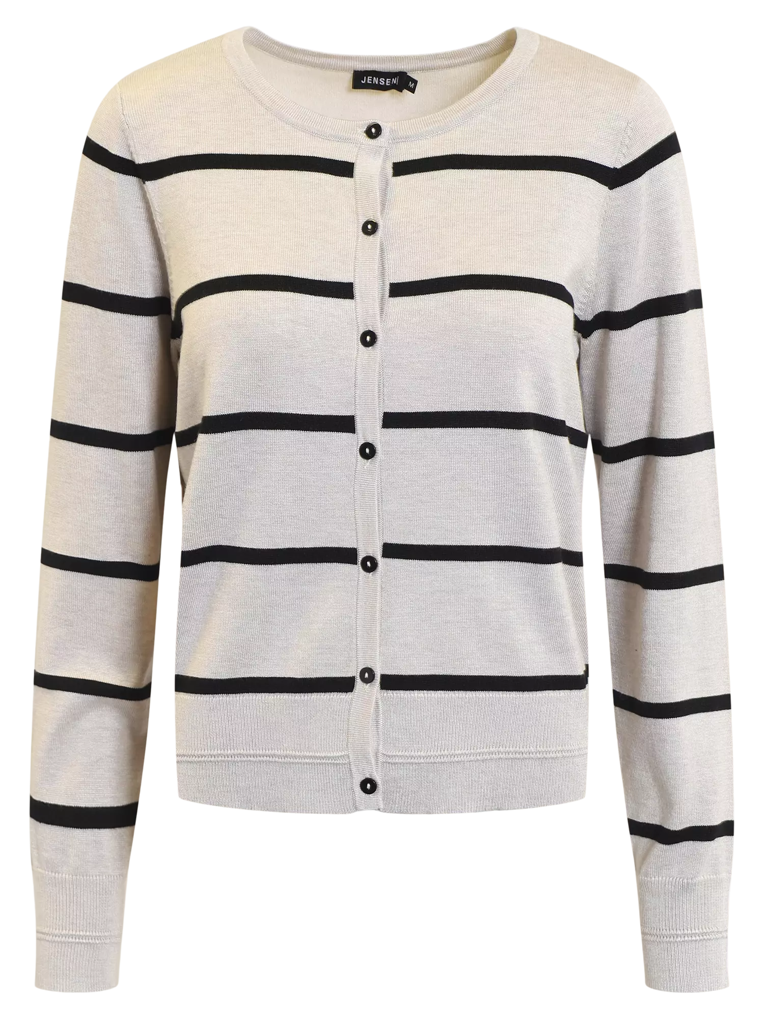 219626 Naisten neuletakki raitakuosilla O-aukko Edessä napitus 70% viskoosiai 30% polyesteri Pesu 30° väljässä vedessä Tasokuivaus Silitys* Kuivausrumpu kielletty