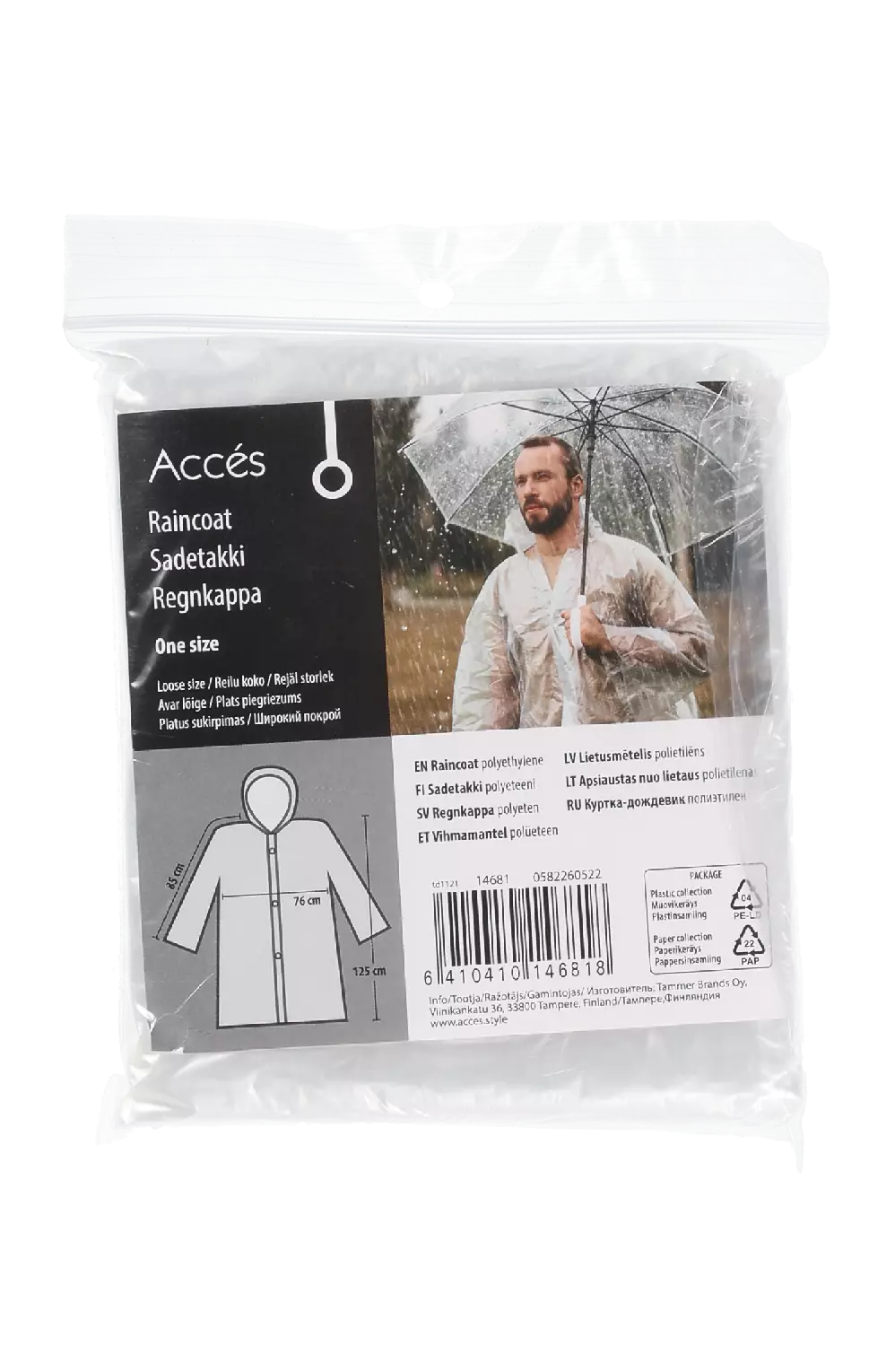 Reilun kokoinen, edestä napitettava hupullinen kertakäyttöinen sadetakki miehille. Pituus olalta 125 cm.
