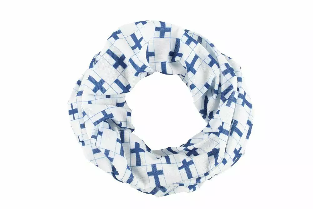 Putkihuivissa on Huivissa Suomen lippu kuviointi. Käsinpesu.