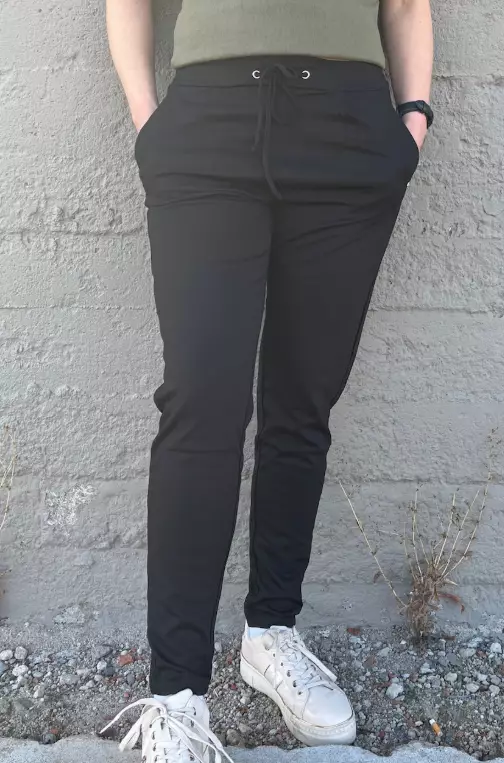 Naisten housut kuminauhavyötäröllä Sivuilla vinotaskut, takana valetaskut 63% viskoosi 32% polyesteri 5% elastaani Pesu 40° Kuivausrumpu kielletty