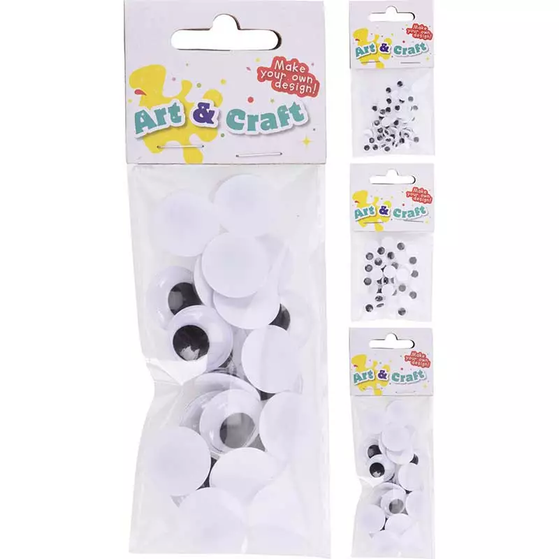 Tee askarteluistasi, piirustuksistasi tai pehmoleluistasi entistä hauskempaa näillä hauskoilla irtosilmillä! Tämä setti sisältää kolme eri kokoa, joten voit luoda loputtomasti variaatioita. Liimaa irtosilmät itse tehtyyn hauskan hahmon piirrokseen tai paperimassatyöhön antaaksesi luomuksillesi leikkisän ja eloisan sävyn. Silmät ovat helppokäyttöisiä. Niissä on itseliimautuva tausta, joten et tarvitse liimaa ja voit kiinnittää ne suoraan pintaan.Silmät on valmistettu muovista.