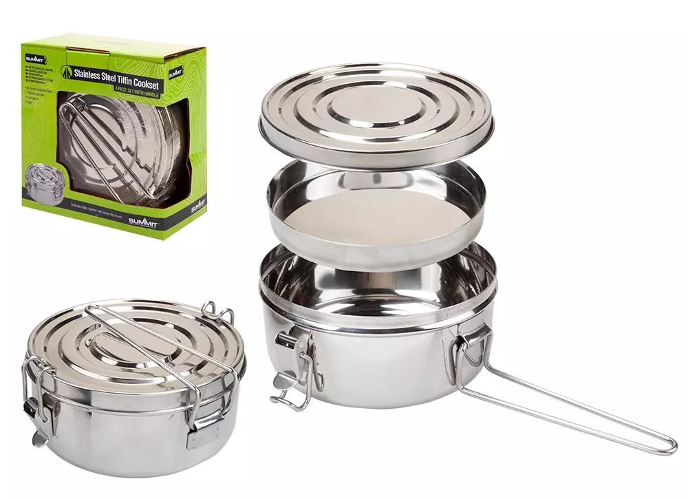 Astiasto sisältää kattilan, kannen ja lautasen. Materiaali ruostumaton teräs. Kattilan koko 1000ml/14 x 6,5cm /paino n. 389g.