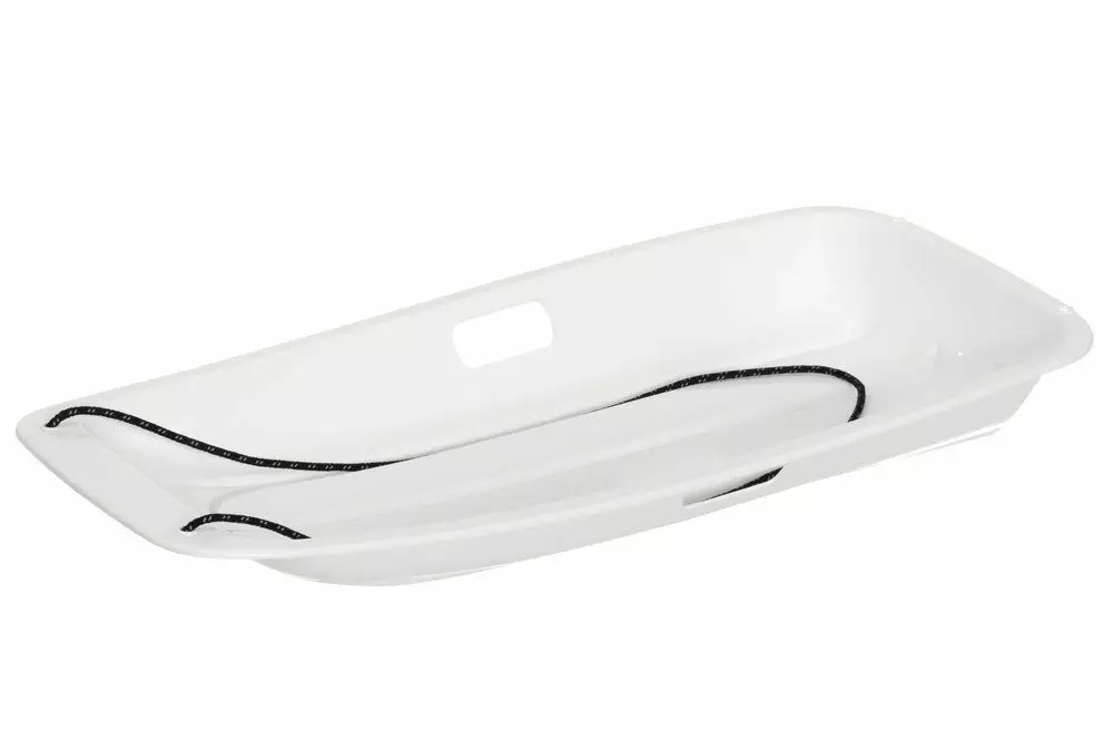 Valkoinen kestävä peruspulkka. Vetonarussa heijastava lanka. Pulkan sivuilla kädensija-aukot kiinnipitämistä varten. Koko 40 x 89 cm.