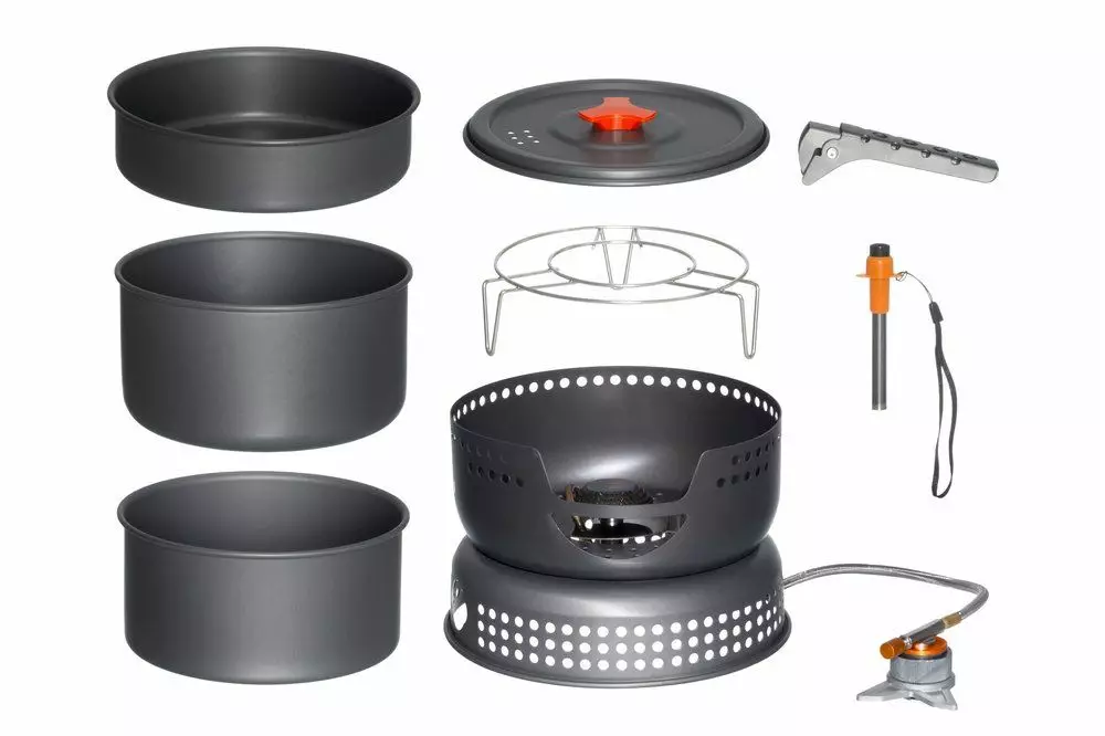 Tehokas ja monipuolinen kaasukäyttöinen retkikeitinsetti. Kevyt, helppo pakata mukaan ja voit kokata missä haluat. Retkelle tai kotivaralaatikkoon. Pakkaus sisältää: kaasupolttimen, kolmijalkaisen tuen, tuulisuojan, paistinpannun ( halkaisija 18,8 cm), pienen kattilan (halkaisija 17 cm, vetoisuus 1,82 L), ison kattilan (halk. 17,5, vetoisuus 1,92 L), kattilan kannen, pääjalustan, kaasusäiliön muuntopään, sytyttimen ja kahvan. Keittimen koko 203 x 63 mm.