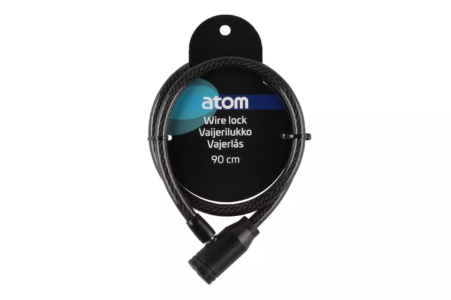 Musta vaijerilukko. Lukko sopii erinomaisesti polkupyörien, porttien, ulkoiluvälineiden, matkatavaroiden ja urheiluvälineiden turvaamiseen. Pituus 90 cm, halkaisija 12 mm. Mukana kaksi avainta.