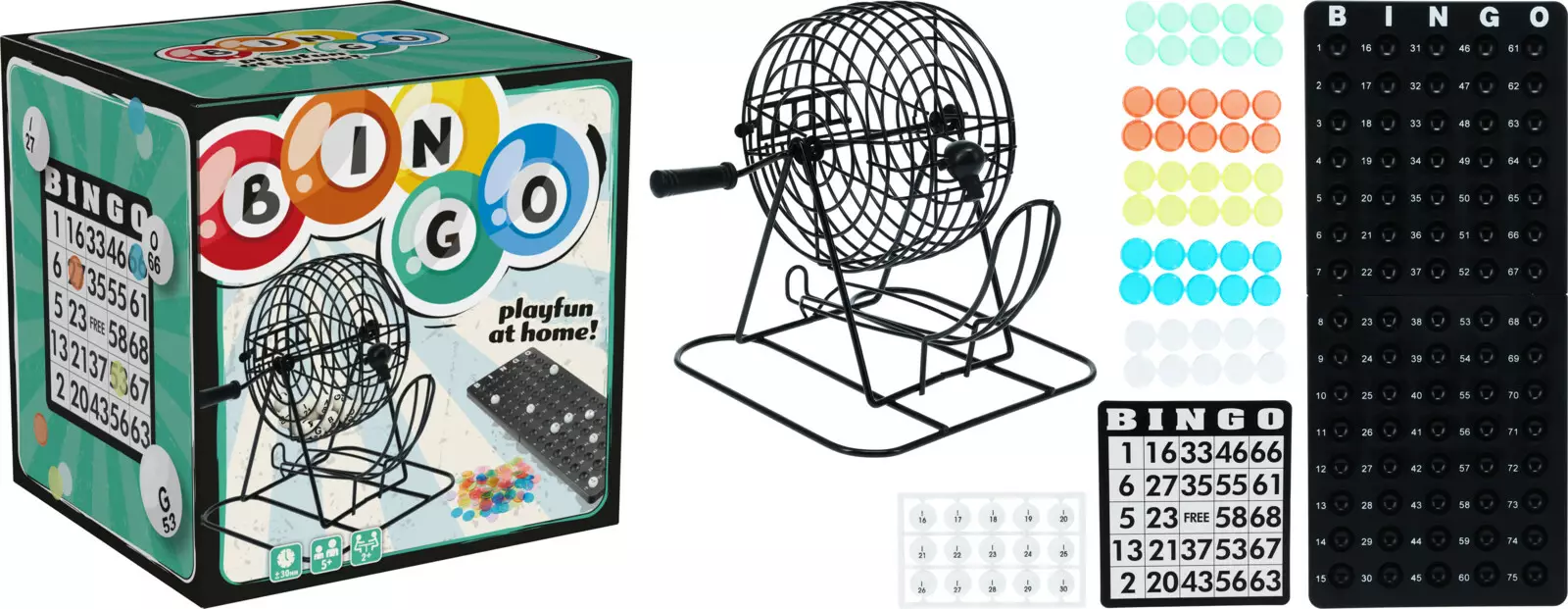 Bingo-peli 18×18×16 cmKlassinen bingo-peli, joka tuo hauskanpitoa koko perheelle! Setti sisältää metallisen arvontarummun, numeropallot, pelilaudat ja merkit. Täydellinen illanviettoihin, juhliin tai perheen yhteisiin pelihetkiin. Sopii 2 tai useammalle pelaajalle.