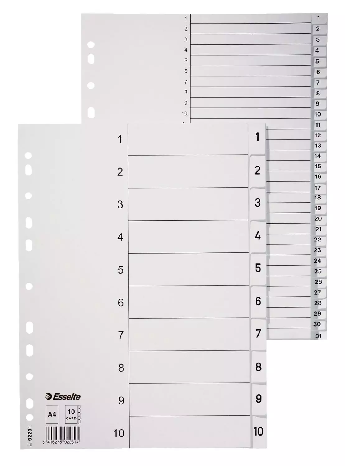 Korkealuokkainen, kirkkaanvalkoinen perinteinen rekisteri. Helppo luetteloida – painettu etukansi Kestävä– vahvennetut mapitusreiät VäriValkoinenMitat (LxKxS mm)225 x 5 x 297KoolleA4 MalliJako 1-31Paino (g)285