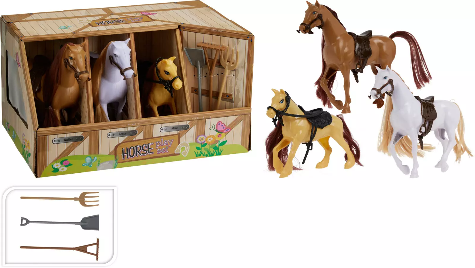 Hevossetti tallissa – 2 hevosta ja 1 poniyksilö, mukana 3 tarvikettaIhana hevossetti tallissa tarjoaa monipuoliset leikkihetket hevos- ja maatilateemasta innostuneille! Setissä on kaksi hevosta (valkoinen ja ruskea) sekä yksi keltainen poni. Mukana kolme käytännöllistä tarviketta, jotka tuovat lisää hauskuutta ja realismia leikkeihin.Tuotetiedot:Hevosten koot:Hevonen (valkoinen/ruskea) 19 x 6 x 16 cmPoni (keltainen) 17 x 6 x 13 cmMukana 3 tarvikettaSopii eläinten ystäville ja mielikuvitusleikkeihinTäydellinen lahja hevosista innostuneille lapsille!