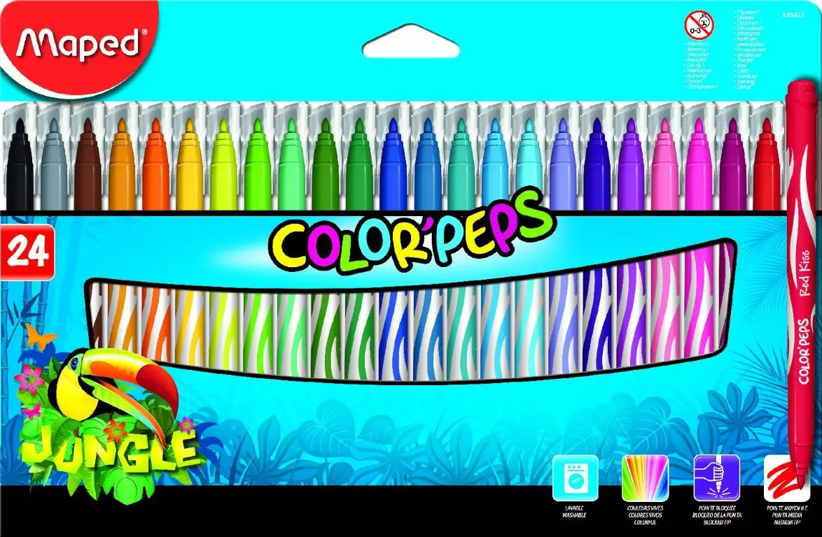 Turvalliset ja pestävät Maped Jungle huopakynät ovat kestäviä ja niissä on kirkkaat värit. Pehmeä 2,8 mm kärki.