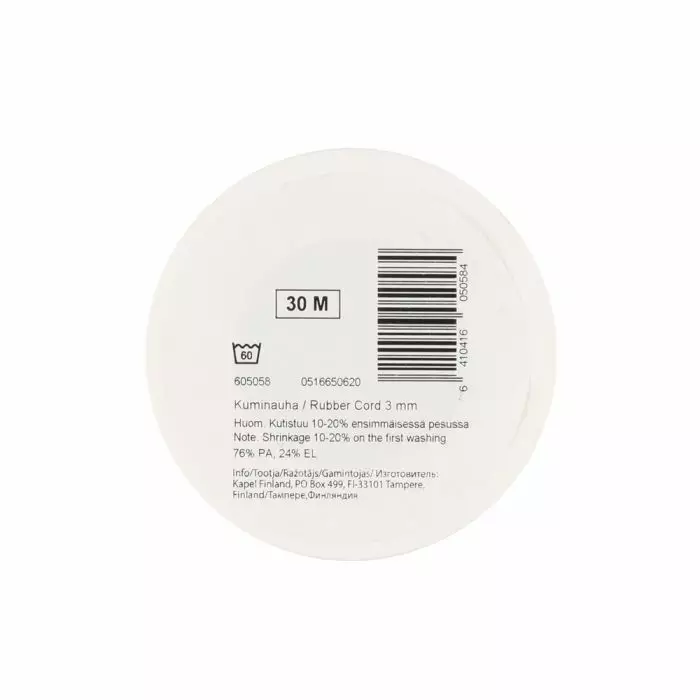 Pyöreä kuminauha, joka soveltuu erinomaisesti itsetehtyihin maskeihin. Pehmoinen laatu. Ei sisällä lateksia. Suositus 60 asteen pesu, saattaa kutistua pesussa noin 10-20%.
