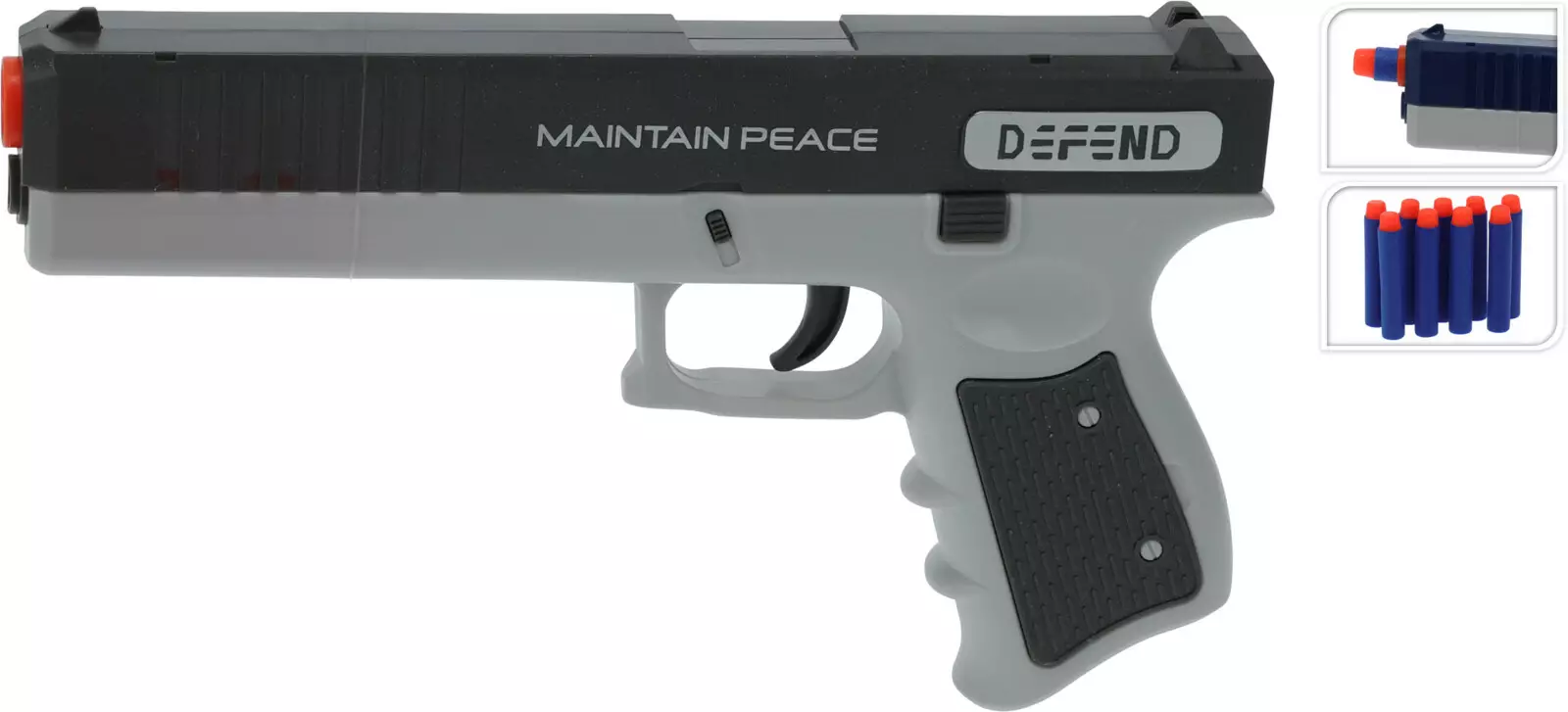 Hauskaa ja turvallista leikkiä luvassa tällä dart-leikkipyssyllä! Pakkaus sisältää 22,5 cm kokoisen pyssyn ja 10 pehmeää EVA-nuolta. Saatavilla kaksi erilaista pyssymallia – malli valikoituu satunnaisesti.