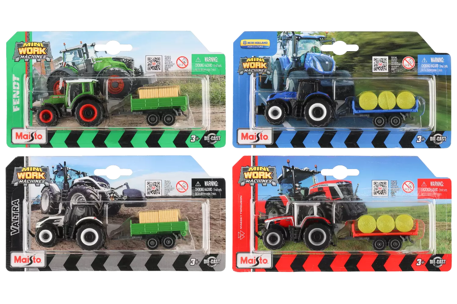 Pienikokoinen traktori ja peräkärry-yhdistelmä valumetallirungolla ja muovisilla yksityiskohdilla. Vapaasti pyörivät renkaat. Ikäsuositus 3+.