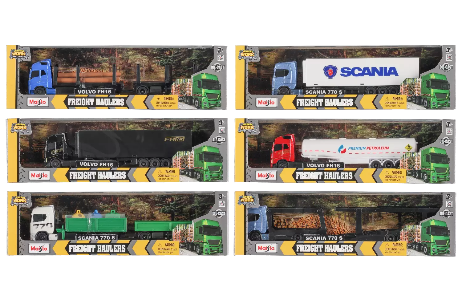 Lajitelmassa Volvo FH16 ja Scania 770 S rahdinkuljetus leikkisettejä. Ikäsuositus 3+.