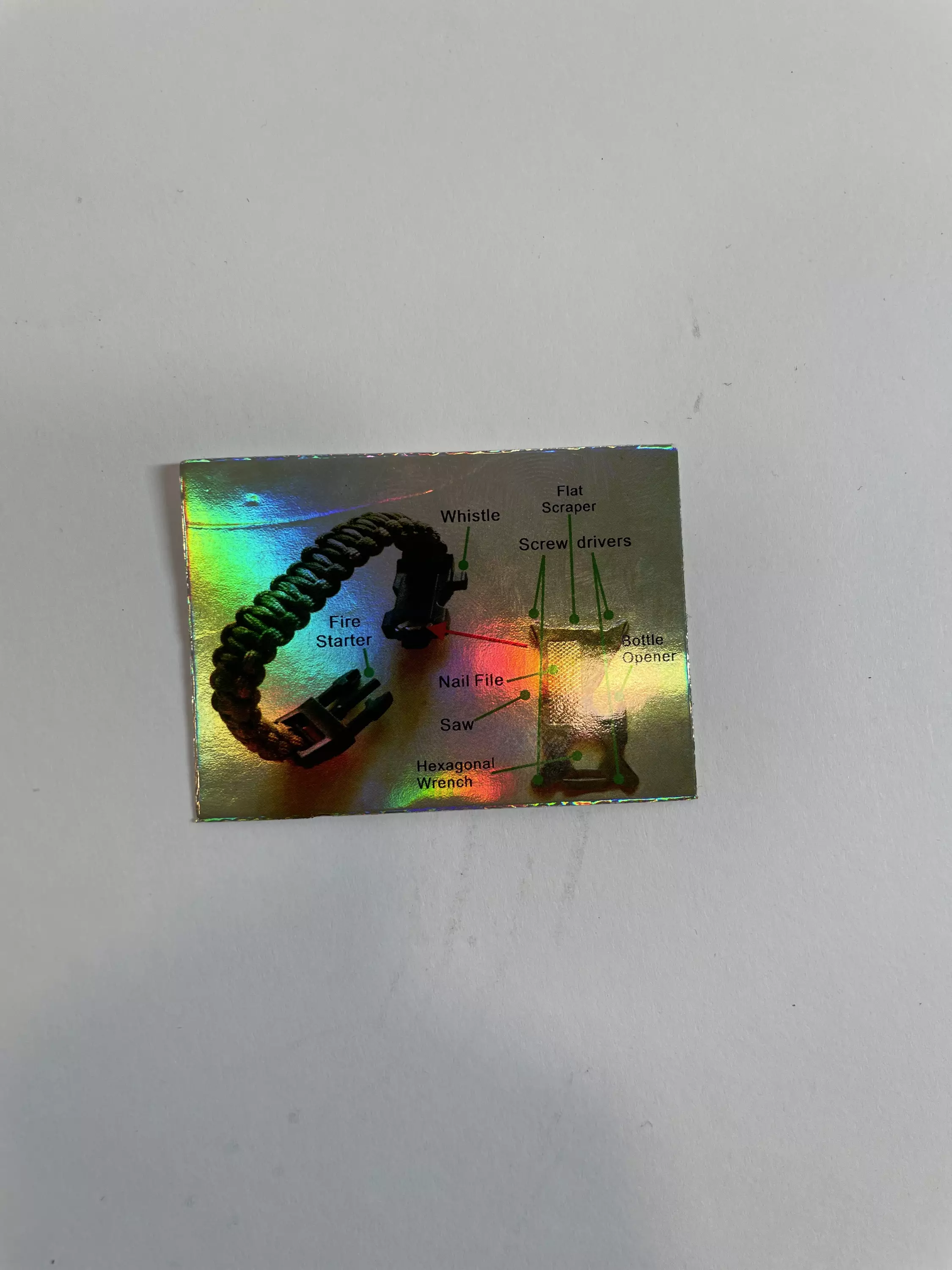 Ranneke mikä sisältää Pillin, kynsiviilan, kipinä teräksen,2 ruuvimeisselin päätä, kompassin, lämpömittarin,sahan,pullonaukaisian,raapian