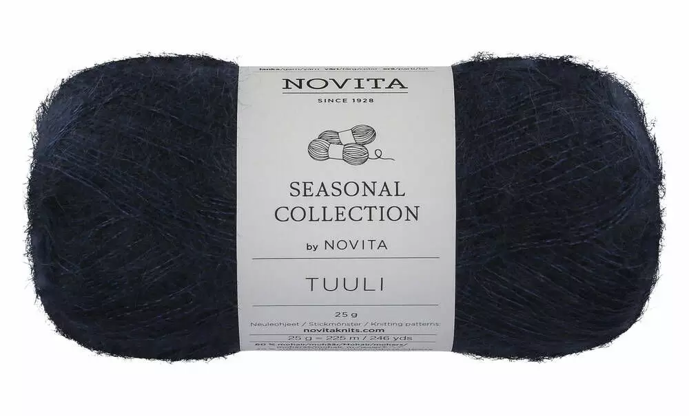Novita Tuuli on pehmoinen mohairsekoitelanka. Puikkosuositus on 3.5. Varovainen käsinpesu.