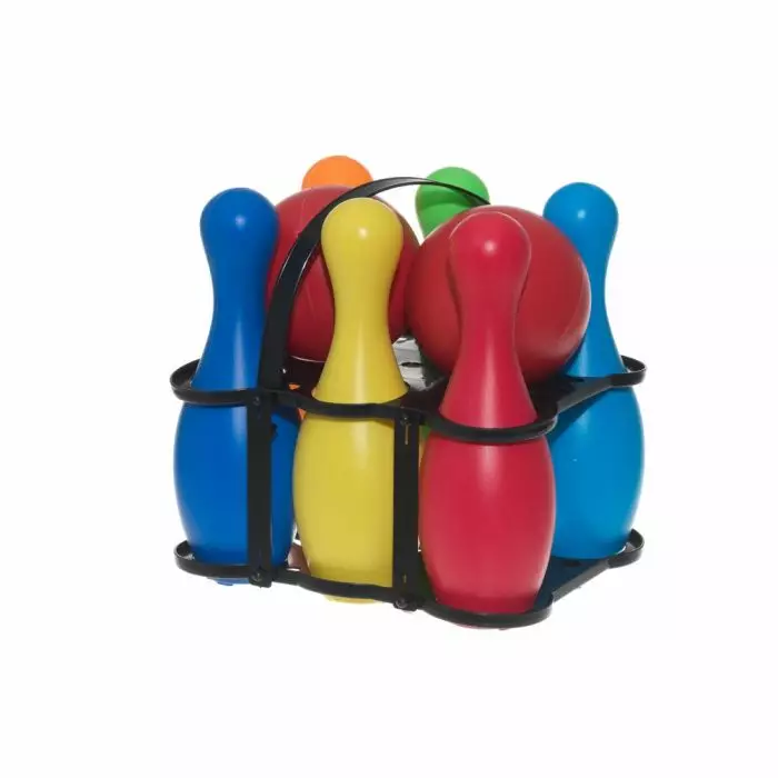 Nyt keilaamaan! Taitoa ja tarkkuutta leikkimällä. Muovinen keilasetti sisältää kuusi keilaa ja kaksi palloa. Ikäsuositus 3+.